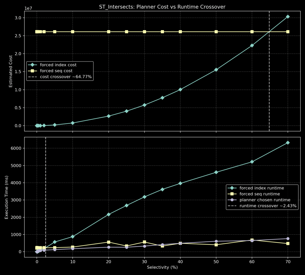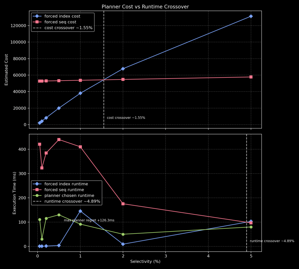 Implication: tuning decisions based only on default planner costs can be misleading. If cost crossover and runtime crossover do not align, there is a selectivity band where the planner may pick a slower path. In practice, this means random_page_cost should be calibrated against measured runtimes on your own workload, not treated as a one-size-fits-all constant.