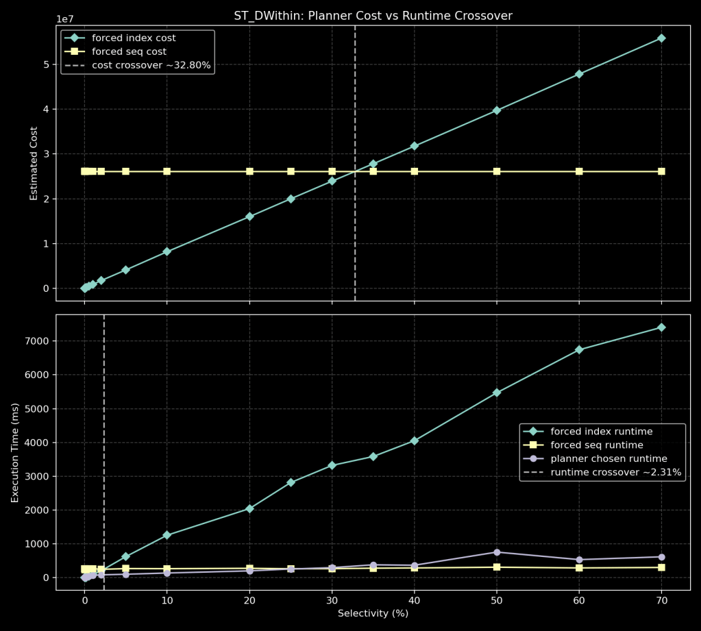 This is an even wider mismatch than ST_DWithin in this dataset: runtime prefers seq much earlier than the planner cost model suggests.
