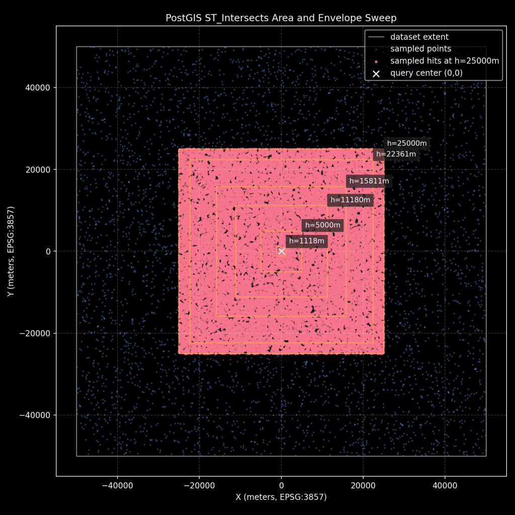 As an aside one thing to notice the the difference in the behavior of the curves for ST_DWithin and ST_Intersects execution times. Both query families use && prefiltering, but they do not pay the same recheck cost.