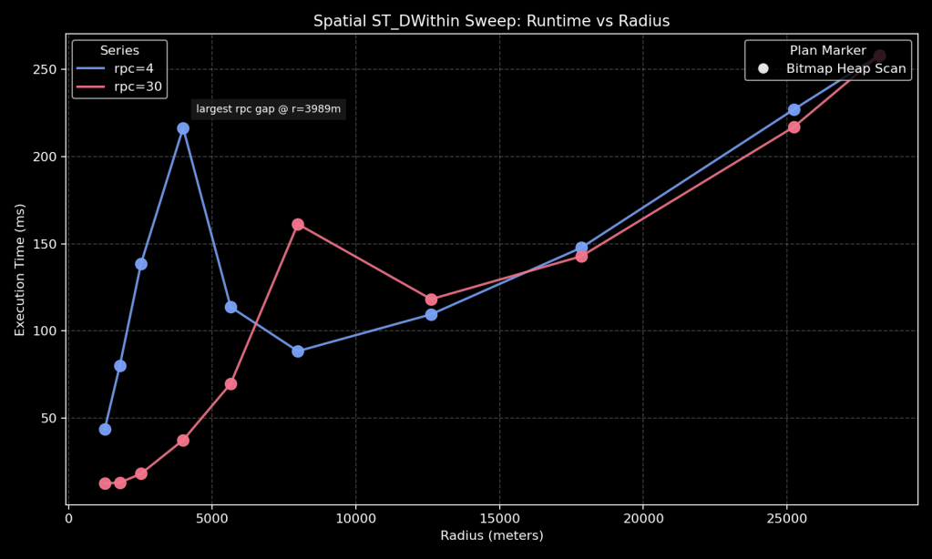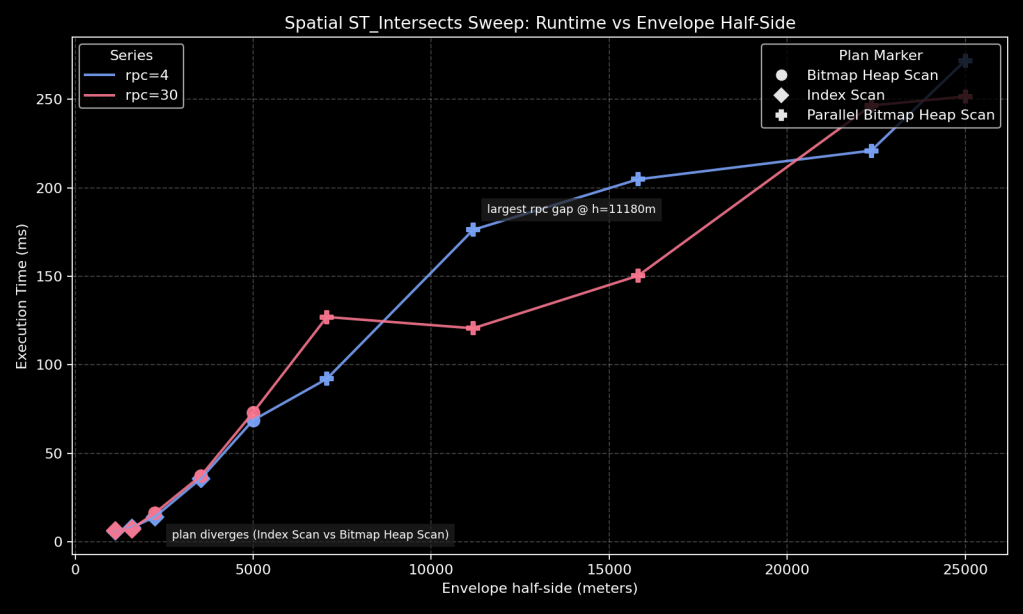 This post looks at that specific failure mode in a spatial context: how a miscalibrated random_page_cost can move crossover points and create a selectivity band where the chosen plan is not the fastest path.