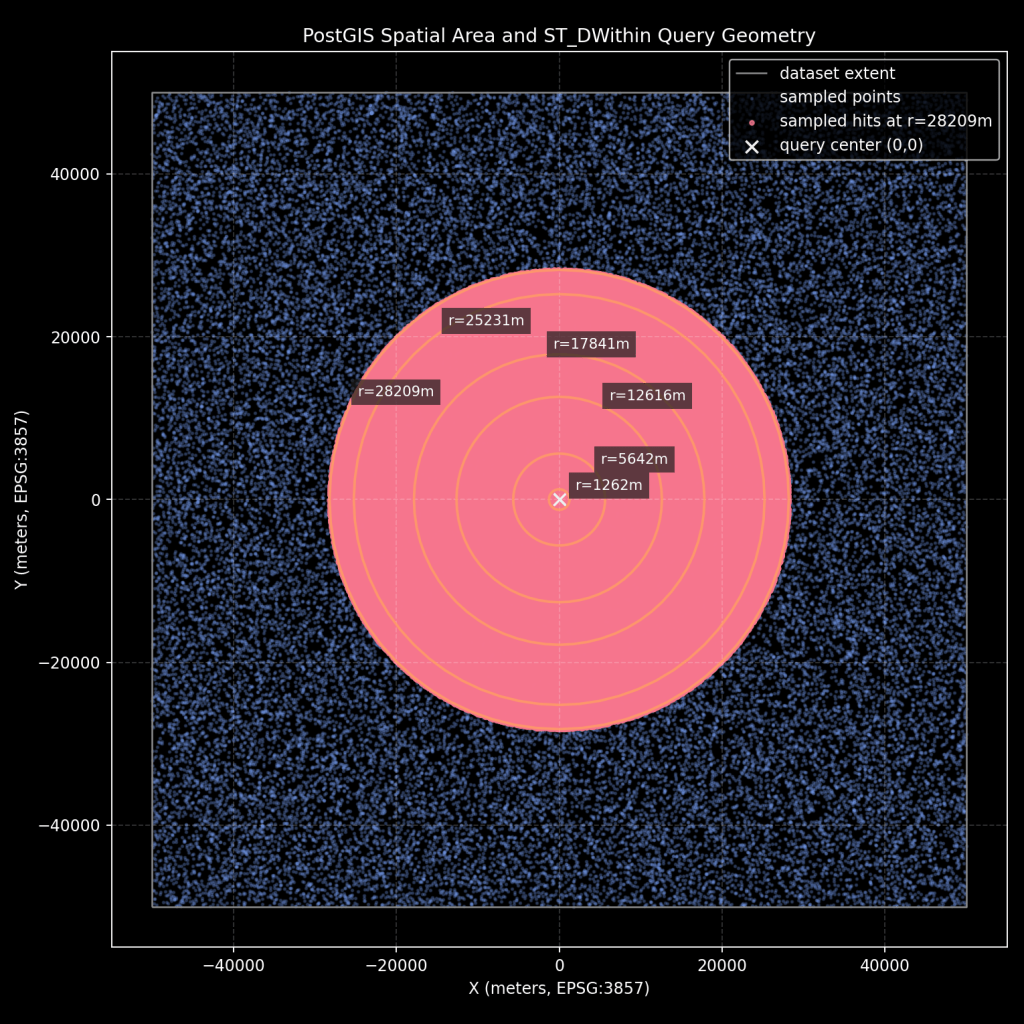 The first map shows the synthetic extent, sampled points, query center, and radii used for ST_DWithin.
